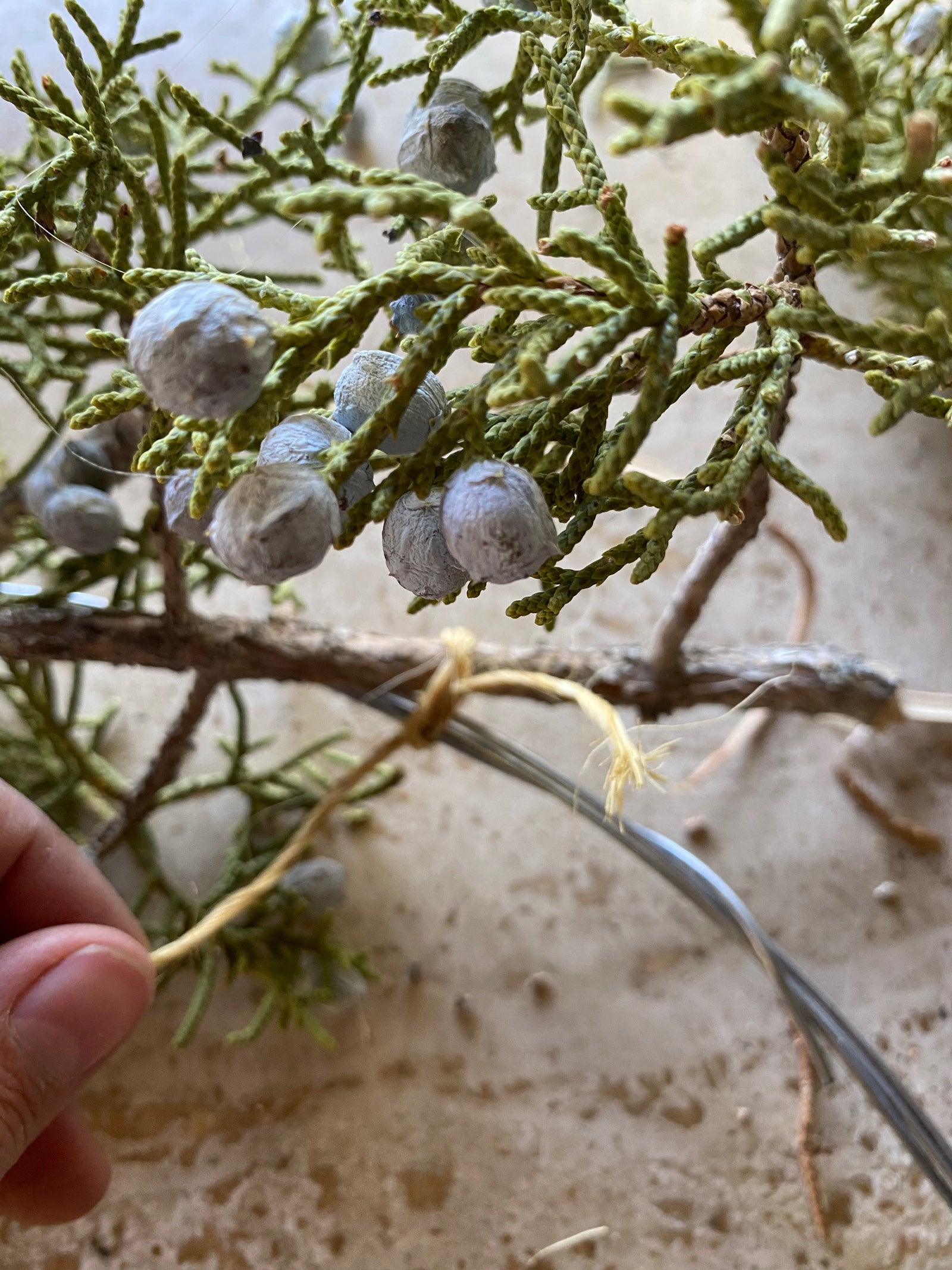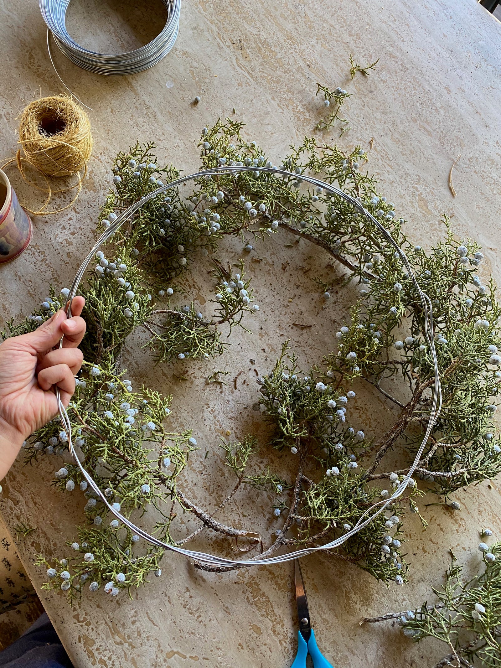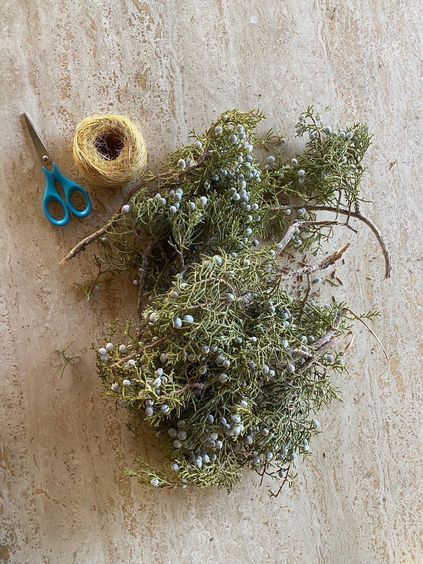 First, purchase or forage the greenery you wish to use to assemble your wreath. Having collected Juniper in the desert several weeks ago, I chose to go with this festive greenery to make my wreath. Pine, Bay Leaves, or Eucalyptus can also work.
