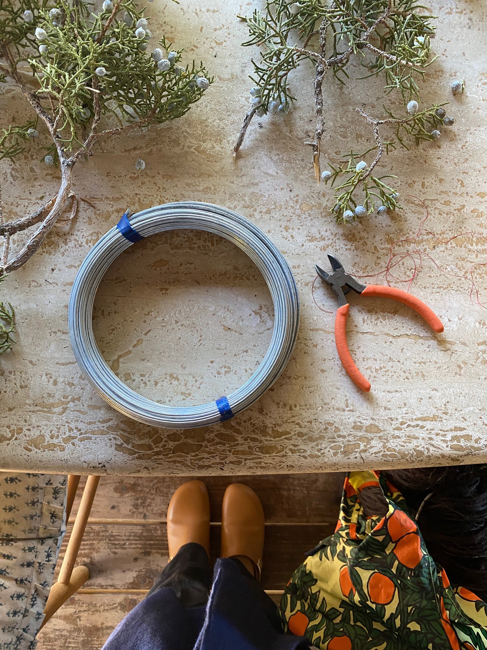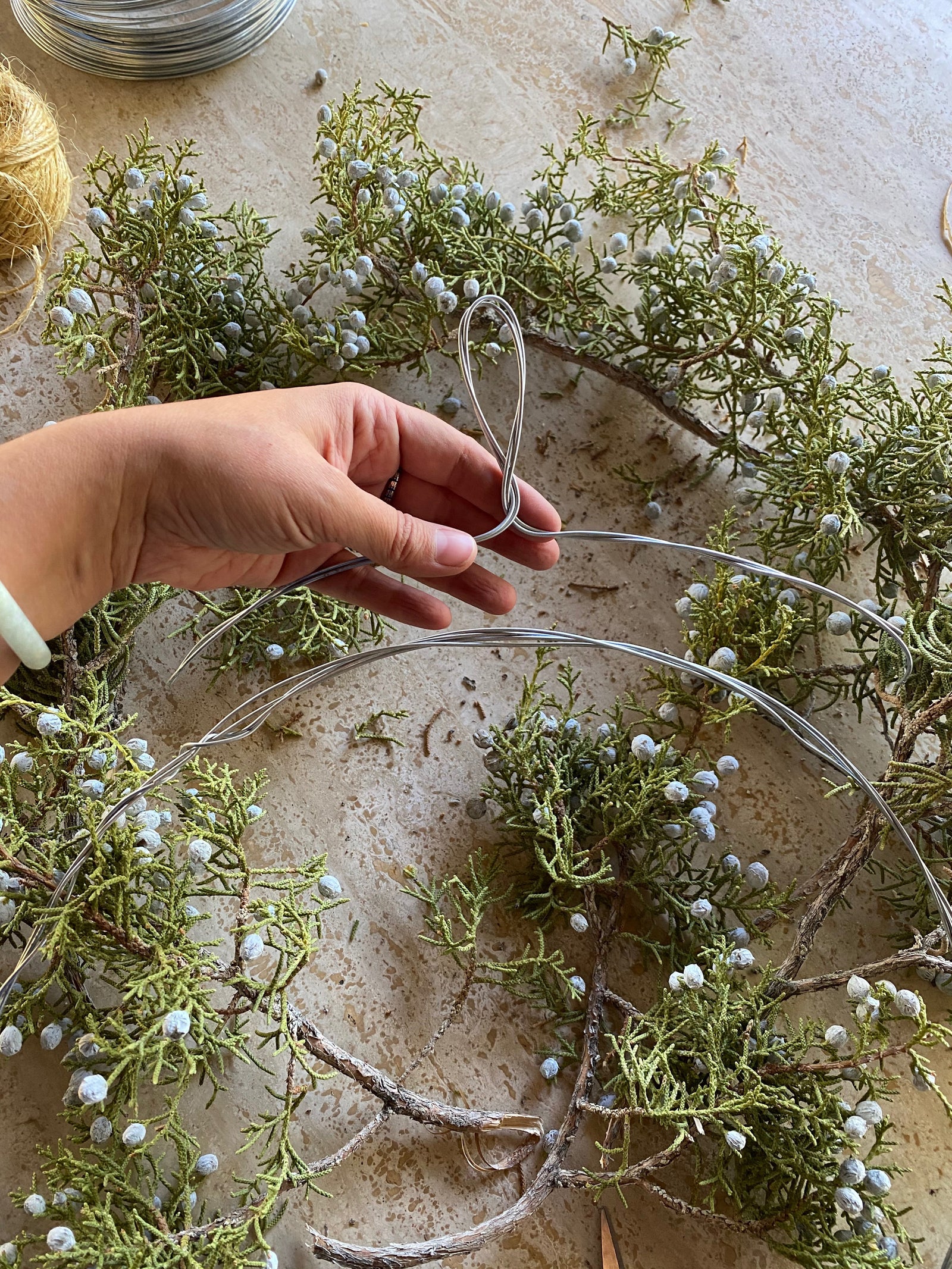 After deciding which greenery you will use, shape the wire into your ideal, rounded size. Be sure to twist a section at what will be the top of the wreath into a loop- that will be where the wreath will hang once completed. Then, plan out the placement of the plants and branches on the shaped wire.