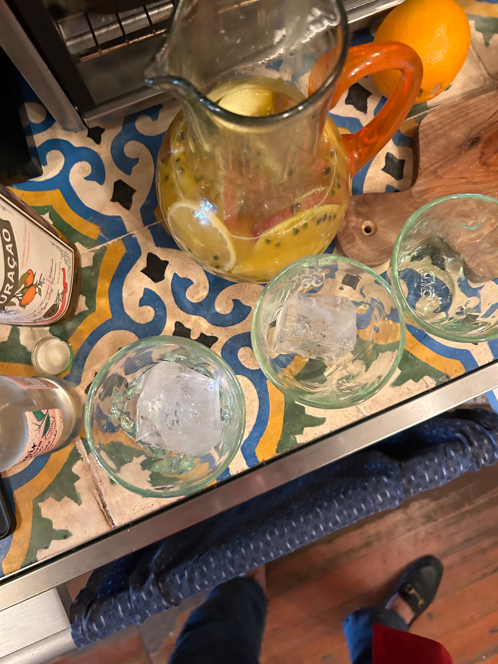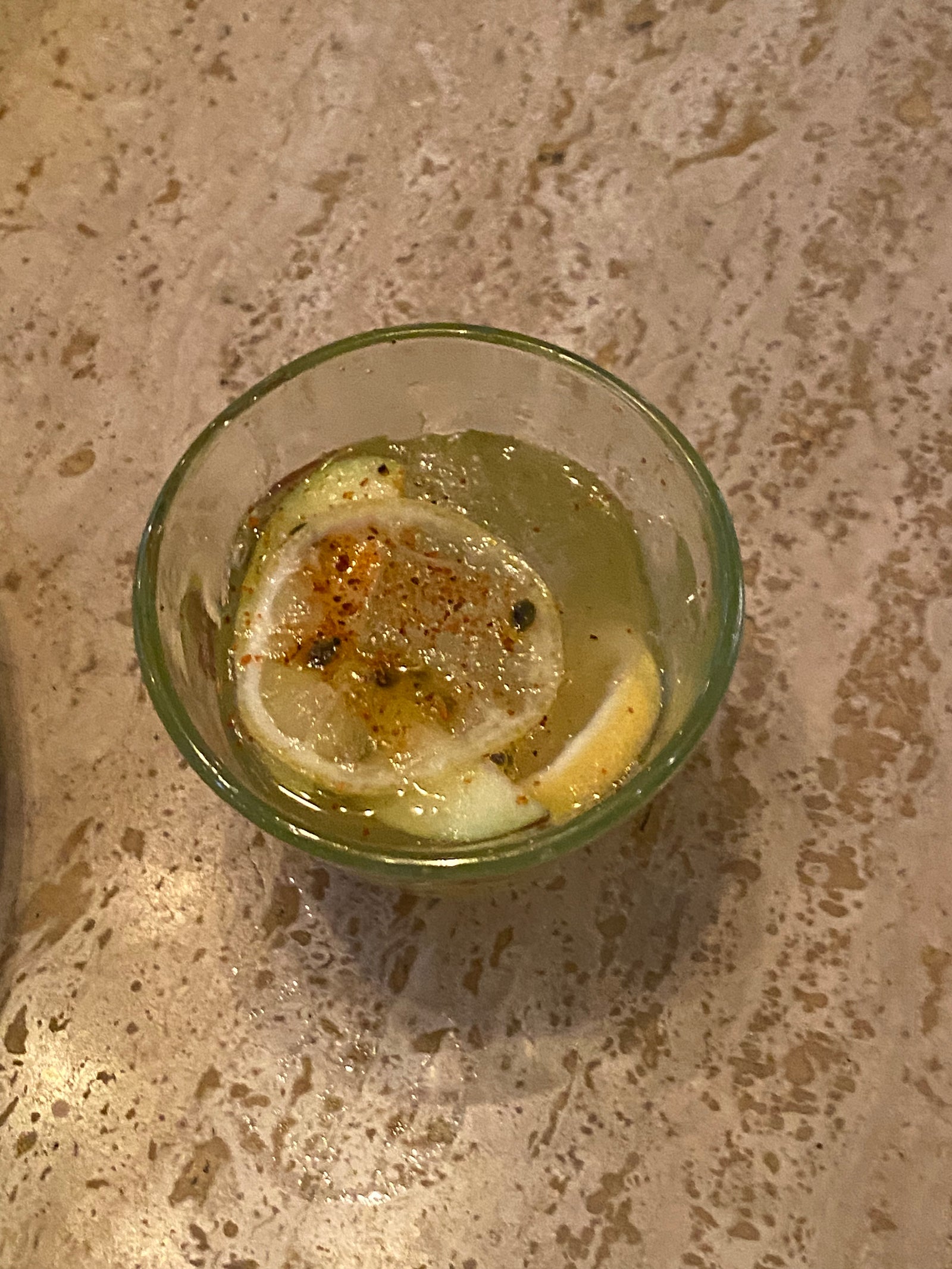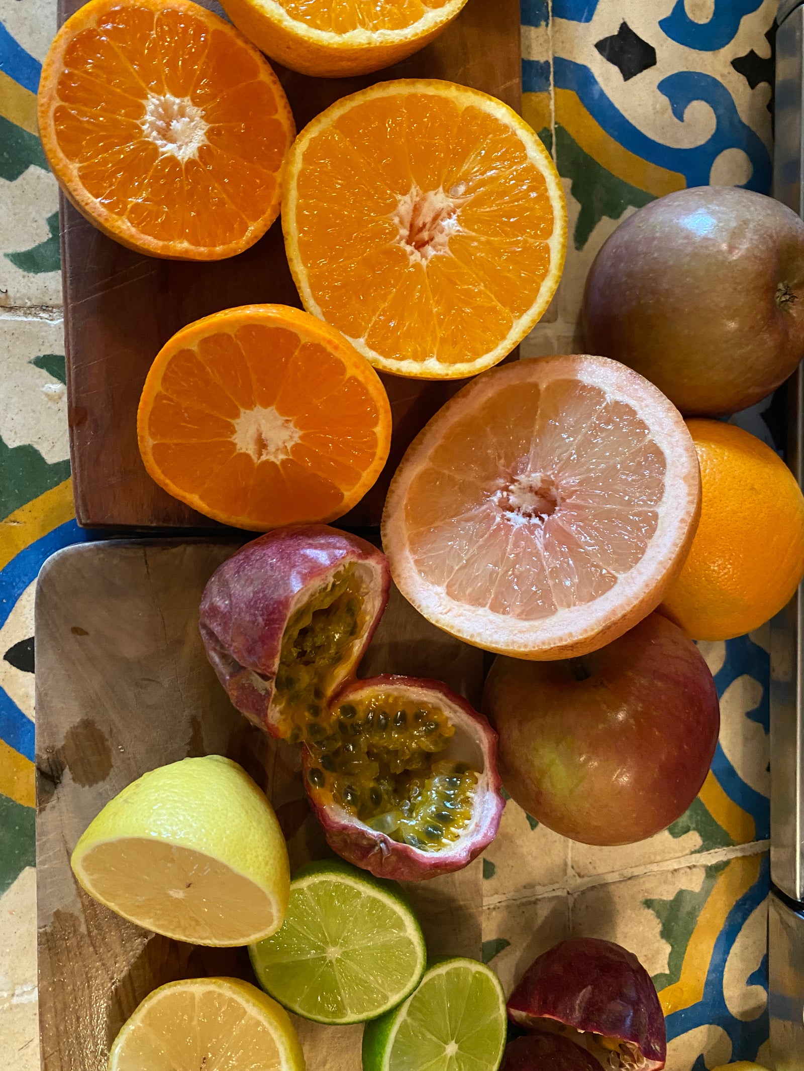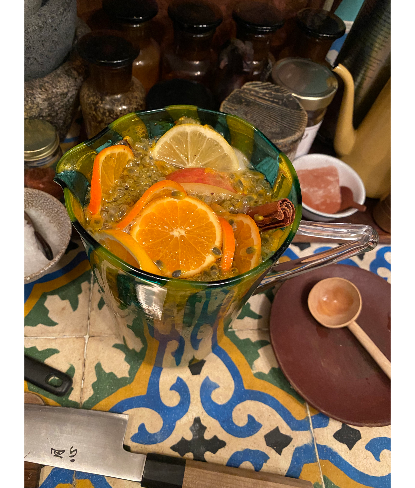 Cut fruit in wedges and add all ingredients to a pitcher or jar. Mix and let rest for 5-10 minutes then add a bottle of Prosecco. Top with a little grapefruit sparkling water and tajín.